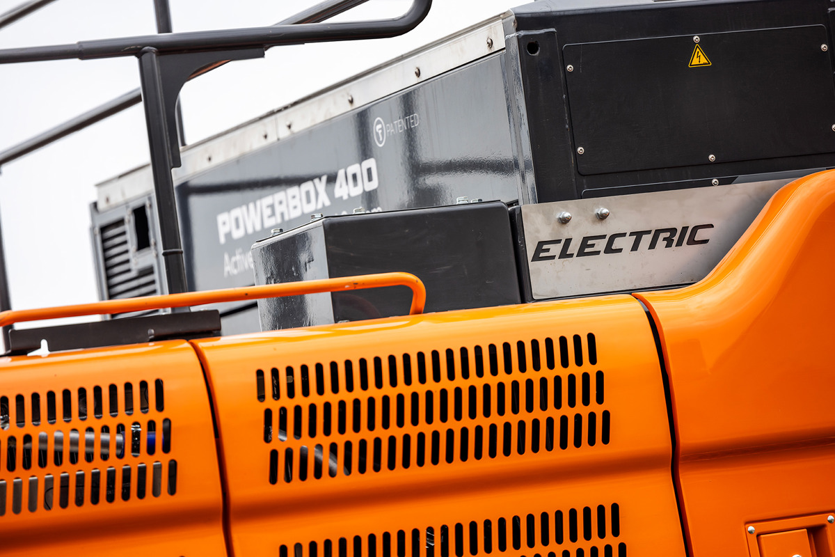 Maskinen är utrustad med tre utbytbara Powerbox 400-batteripack, med en sammanlagd kapacitet på 1200 kWh. Detta möjliggör drift under en full arbetsdag vid normal användning.