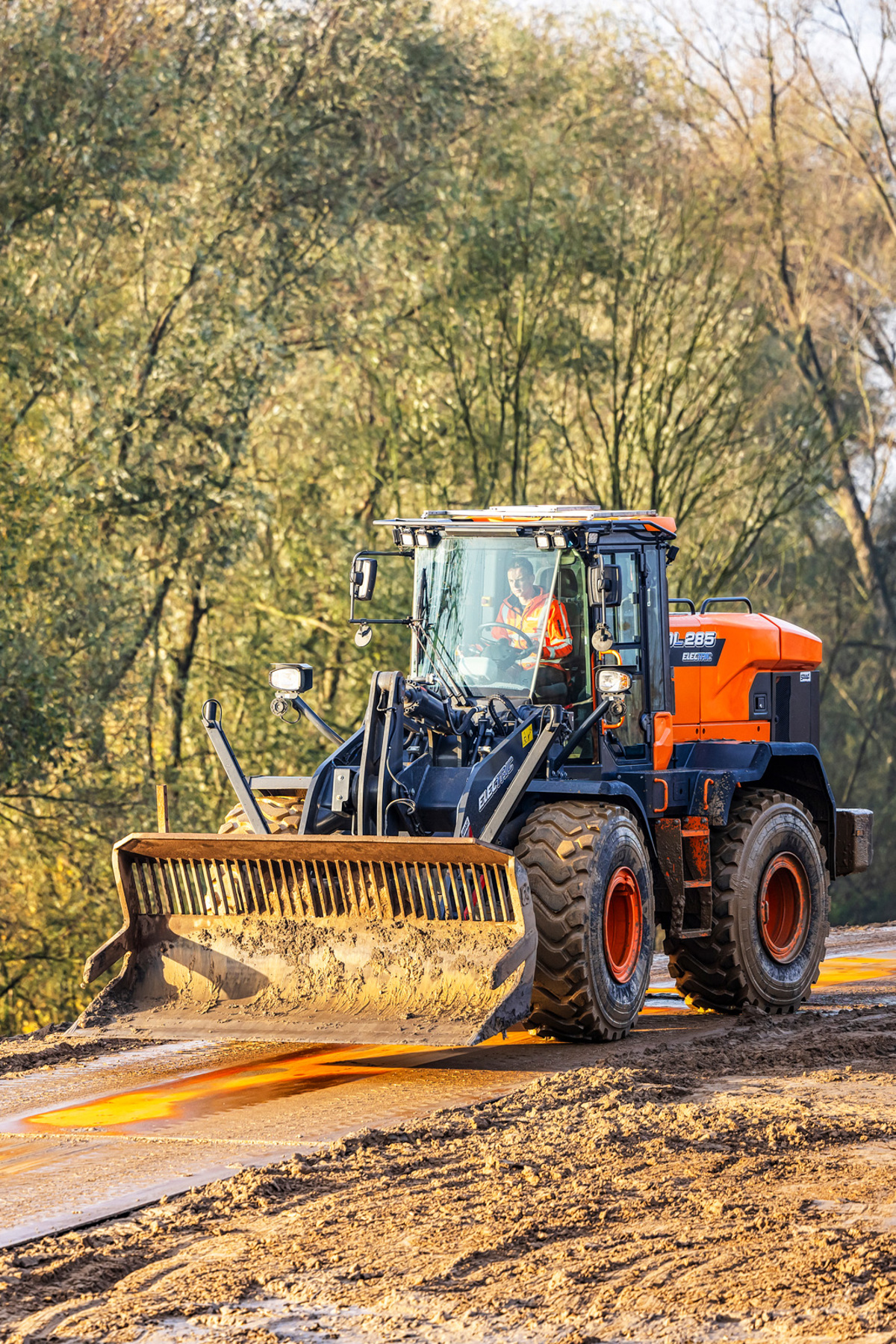 DL285 Electric hjullastare är 100% utsläppsfri och byggd med ambitionen att kunna nyttjas en hel arbetsdag utan stödladdning. Detta blir verklighet då denna hjullastare är utrustad med en Danfoss SPRM motor med hög konstant effekt på 140 kW och en inbyggd Powerbox 400 som kraftkälla. Dessa komponenter jobbar tillsammans i ett högspänningsbaserat system för minimala energiförluster och ökad effektivitet. Med dagens krav på hållbarhet och omtanke för miljö är DL285 Electric en maskin att räkna med. Helt fri från utsläpp av avgaser utan att du behöver kompromissa med produktiviteten.