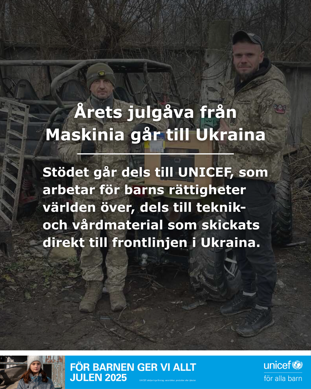 Maskinia har valt att rikta årets julgåva till kunder, anställda och leverantörer till humanitärt stöd i Ukraina. En större del av gåvan går till Unicef som arbetar för att skydda alla barns rättigheter– vem de än är och var de än bor. Den andra delen består av teknik- och vårdmaterial som transporterats med lastbil direkt till frontlinjen.
